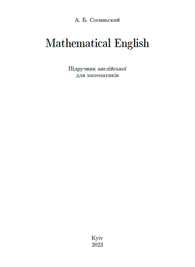 Цю невеличку книгу адресовано студентам, якi вивчають математику в українських унiверситетах, а також всiм математикам, хто прагне пiдвищити свiй рiвень сучасної англiйської математичної мови. Опрацювавши книгу, ви зможете писати математичнi статтi й книги пристойною англiйською, i навiть зможете перекладати математичнi статтi англiйською мовою на рiвнi, близькому до професiйного. З книгою можна працювати систематично, як з пiдручником (тодi варто виконувати завдання), але нею можна послуговуватися як довiдником (звертаючись, здебiльшого до Додаткiв I та II).